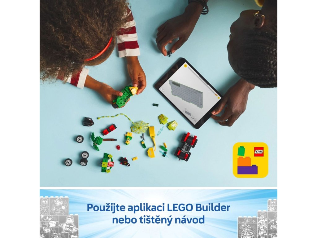 - Umožňuje snadno postavit a okamžitě si zahrát s dynamickými dinosaurími vozidly.