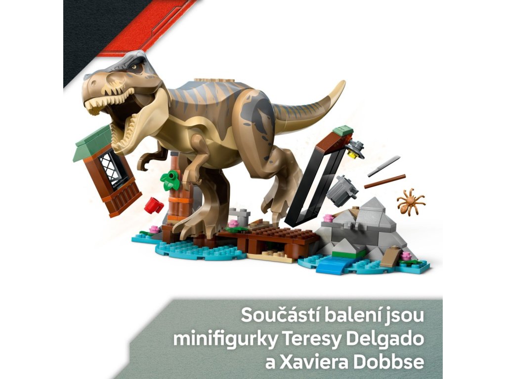 - Pohyblivá figurka T‑rex umožňuje realistické akce, jako je zničení a opětovná výstavba kůlny.
