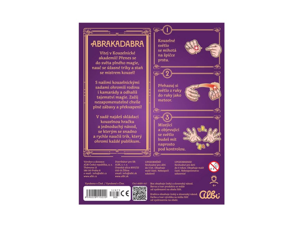 Sada Kouzlení se světlem obsahuje dva návleky na prsty se svítilnami, 2 (vyměnitelné) baterie CR1620 a jednoduchý návod, se kterým se váš malý mistr kouzel snadno a rychle naučí trik, kterým ohromí každé publikum.