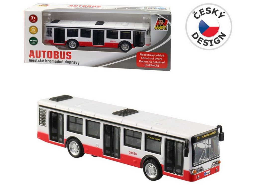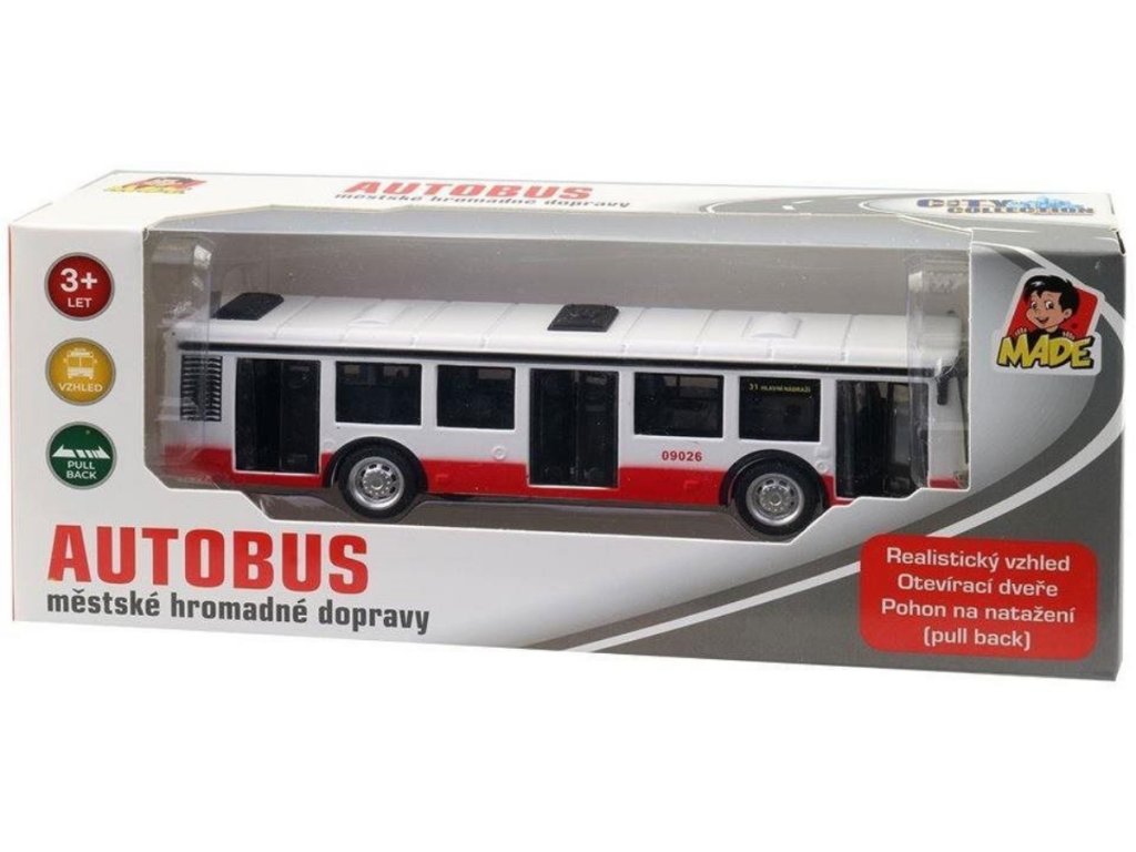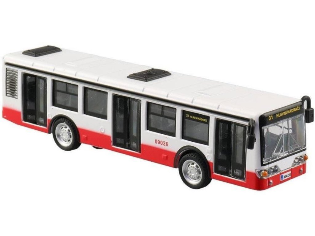Skvělý dárek pro všechny příznivce městských dopravních prostředků. Červenobíločernou barevnou kombinaci můžete vidět na prostředcích městské hromadné dopravy v některých našich městech. Autobus má otevírací dveře. Pohon je na zpětné natažení.
