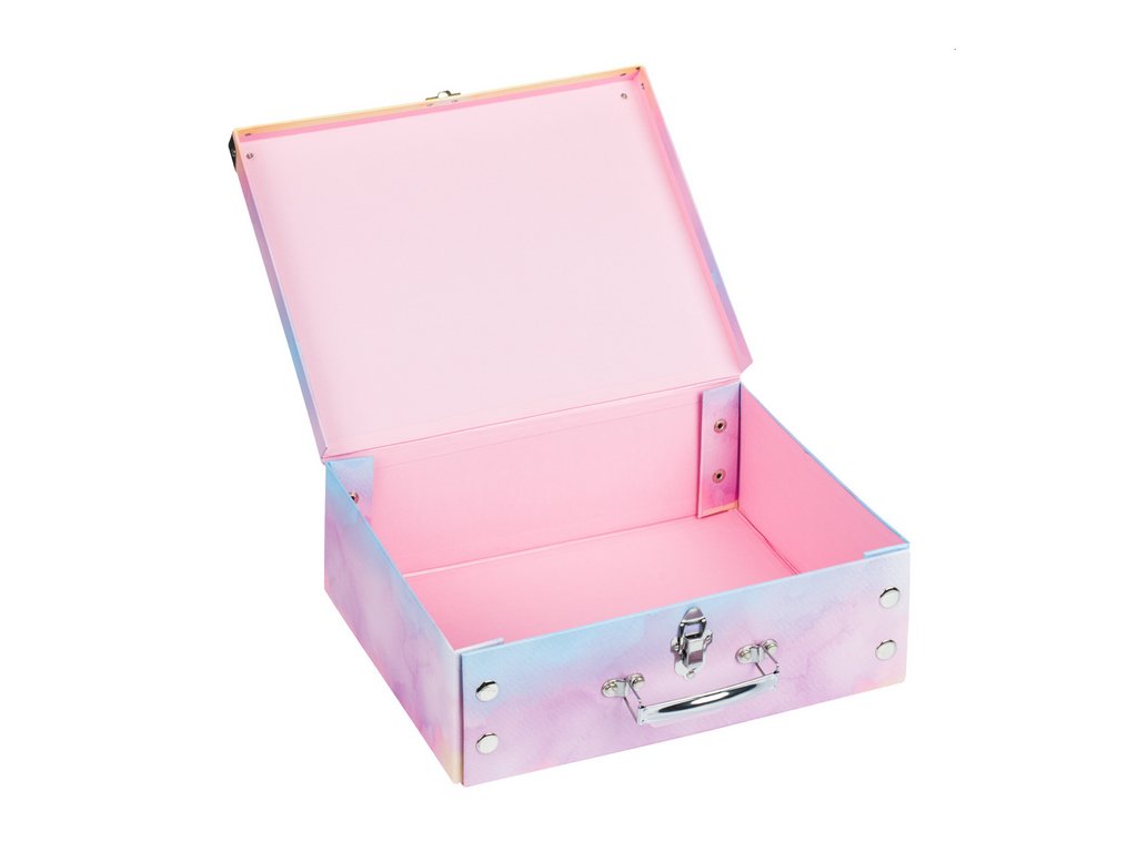 • Skládací kufřík z pevného laminovaného papíru s okovanými rohy.