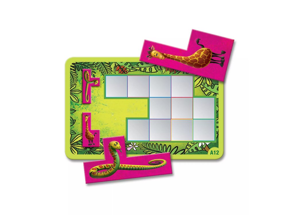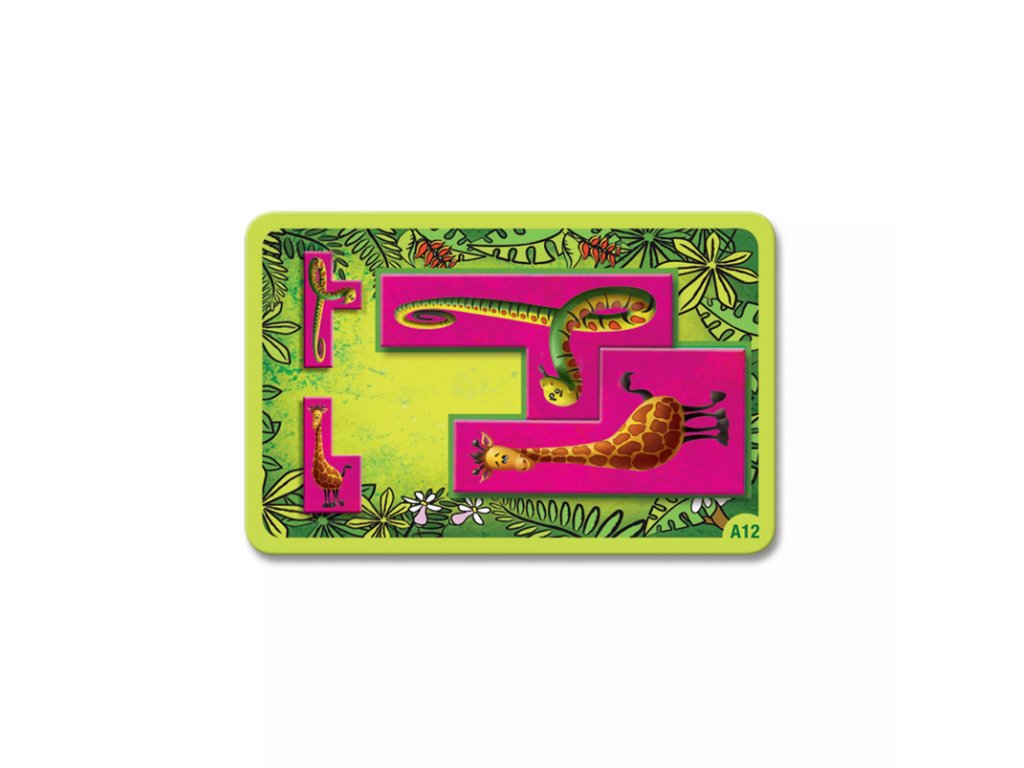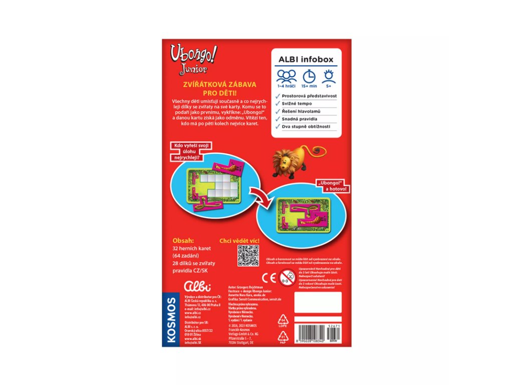 Hra Ubongo Junior Mini obsahuje: 32 herních karet s 64 zadáními, 28 dílků se zvířaty, pravidla.