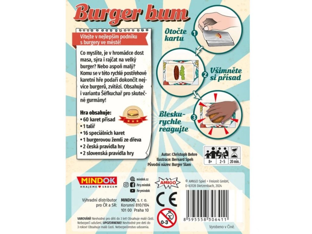 Akční postřehová karetní hra Burger bum je určena pro 2-5 hráčů od 8 let a jedna partie trvá zhruba 20 minut plných napětí a zábavy.