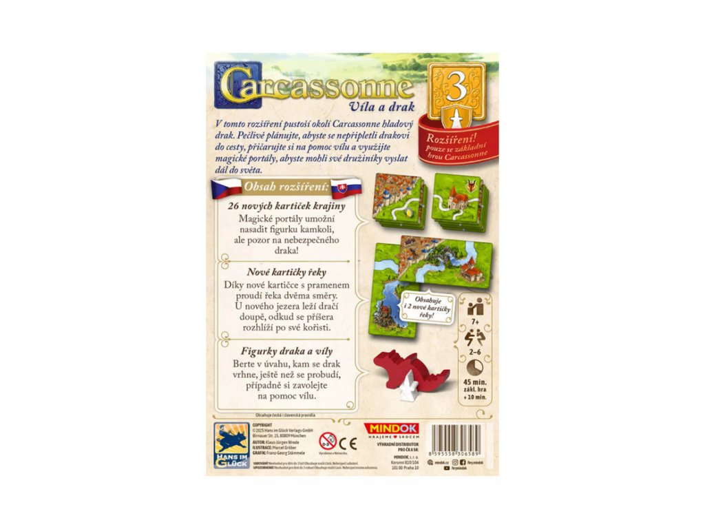 Rozšíření také obohacuje hru o novou startovní kartičku pramenu a speciální kartičku jezera pro hru s minirozšířením Řeka. S 26 novými kartičkami krajiny, drakem a vílou získá vaše Carcassonne zcela nový rozměr plný napětí a strategie. Stejně jako ostatní rozšíření, i toto můžete libovolně kombinovat s dalšími.