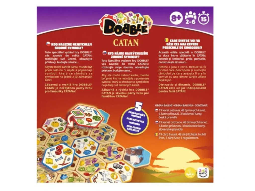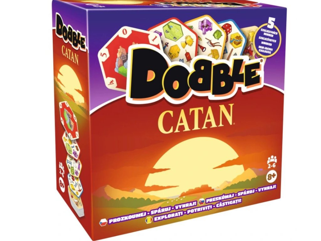 Toto speciální vydání hry Dobble vás zavede do světa Catan: rozšiřujte své území, obsazujte přístavy, budujte silnice!