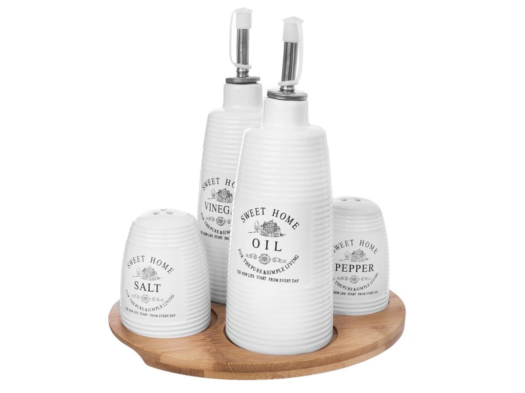 Dochucovací souprava na podnosu - olej, ocet, sůl a pepř budete mít po ruce při vaření i při stolování. Materiál: keramika, nerez, plast, silikon, bambusové dřevo. Dekor SWEET HOME. Rozměry: láhev na olej a na ocet - objem 0,35 l, pr. 7 cm, v. 21 cm, solnička a pepřenka pr. 6 cm, v. 8 cm, podtácek 22x18 cm. Keramika vhodná do myčky na nádobí.Doplňkové parametry