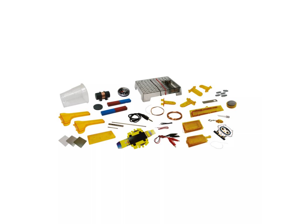 Experimentální sada Magnetismus - 12 hravých pokusů obsahuje: cívku závěsné houpačky, vrchní část závěsné houpačky, nohu závěsné houpačky, vodič, magnet, destičku spínače, kovovou destičku, cívku vahadlové houpačky, nohu vahadlové houpačky, kovový čep, základní desku, pružinové konektory, kartonový výřez figurky, železnou tyč, cívku, vodič s krokosvorkami, cívku motoru, kovový čep, dlouhou nohu vahadlové houpačky, plastový kelímek, malou cívku, kotoučový magnet, sluchátkový konektor, kompas, tyčové magnety, šicí nit, magnetický generátor, LED diodu, kartonový výřez autíčka, plastovou destičku, hliníkovou destičku, železnou destičku, návod.