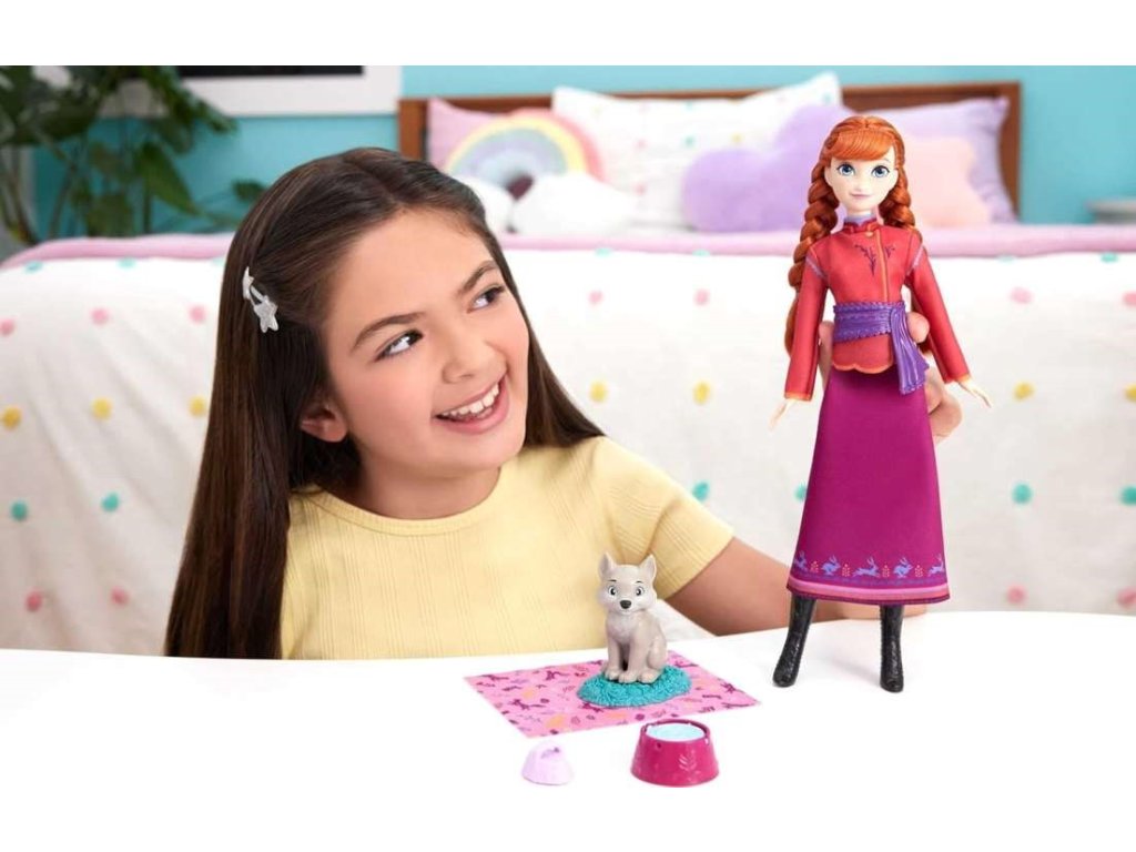 Tento set z Ledového království obsahuje malou figurku vlčete a pět doplňků, které podporují hru na péči – včetně mističky, která se otočením promění na jídlo nebo vodu. Anna má na sobě látkové šaty s páskem a stylové boty.