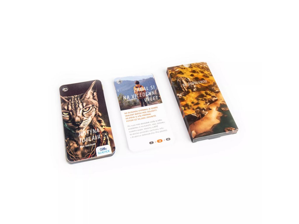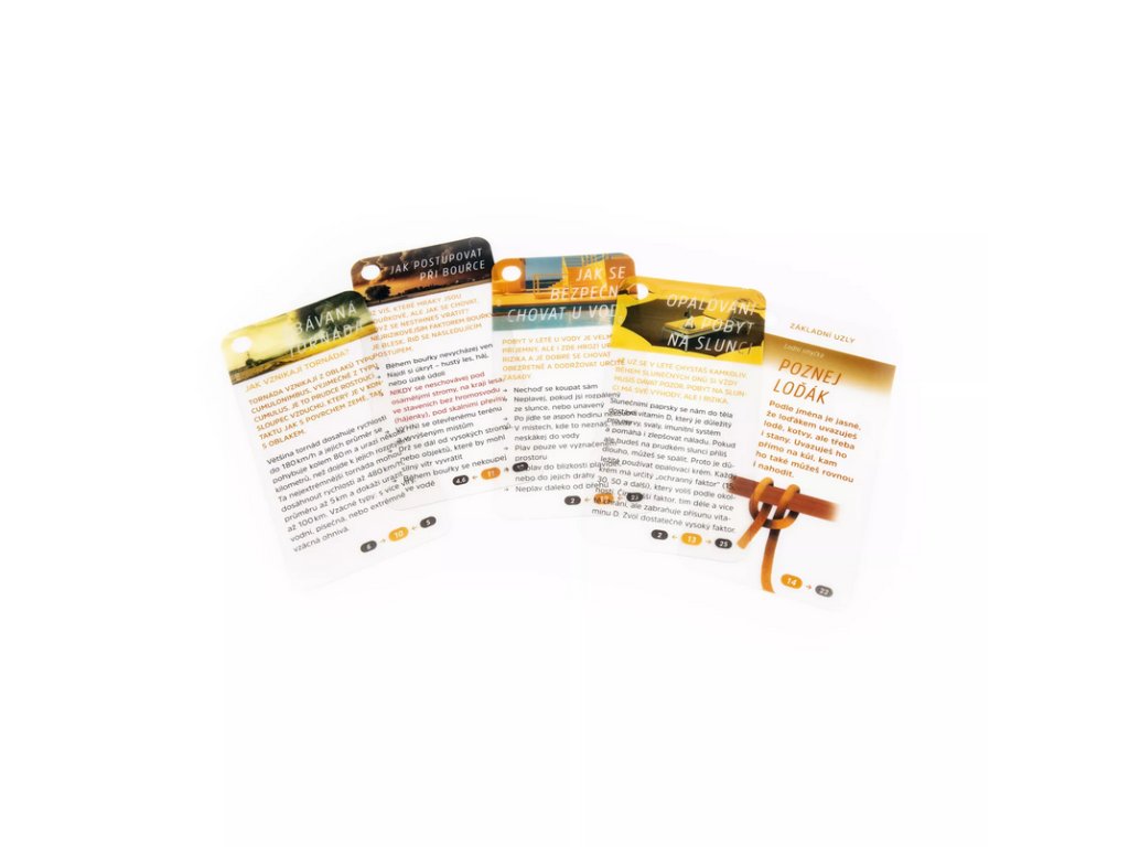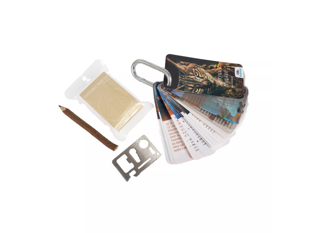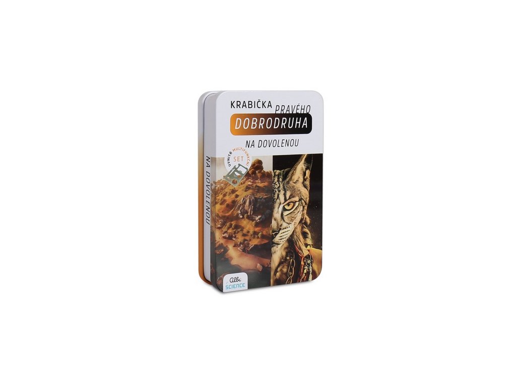 Krabička pravého dobrodruha - Na dovolenou obsahuje: multifunkční nástroj, pláštěnku, tužku, 30 plastových karet se zajímavostmi, karabinu na uchycení karet, návody, pravidla a tipy.