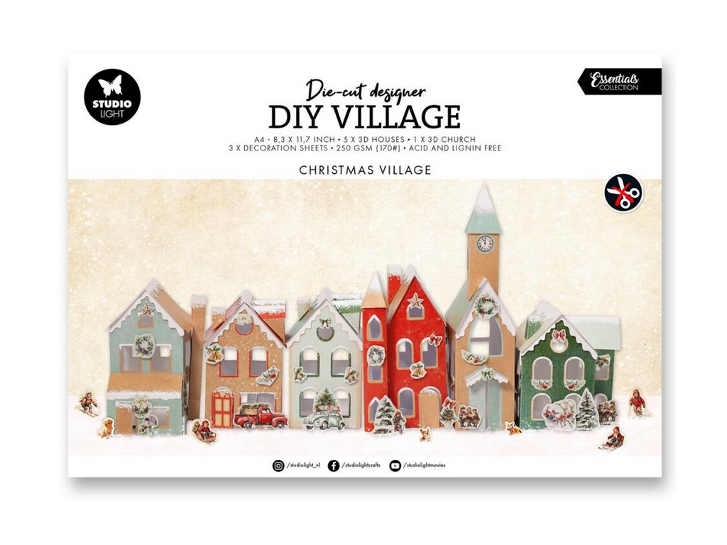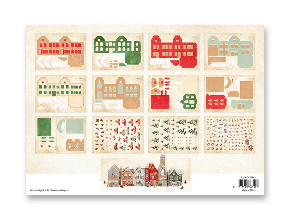 Pláštíky domků i dekorativní prvky se nemusí vystřihovat – mají perforované okraje, takže je stačí ze stránky bloku vyloupnout a poskládat podle narýhovaných čar. Potřebovat budete jenom tekuté lepidlo nebo lepicí pásku. Do okének můžete nalepit pergamenový papír a dovnitř umístit LED svíčky či vánoční světélka. Hotová vesnička bude vypadat krásně vystavená na poličce nebo okenním parapetu.