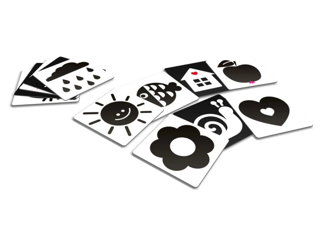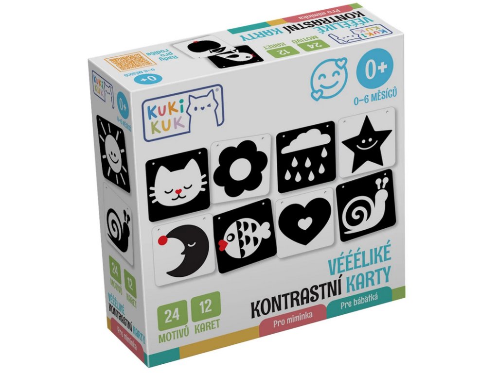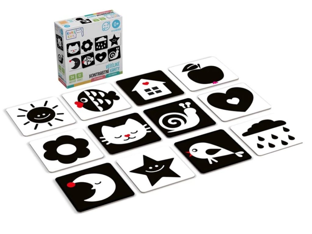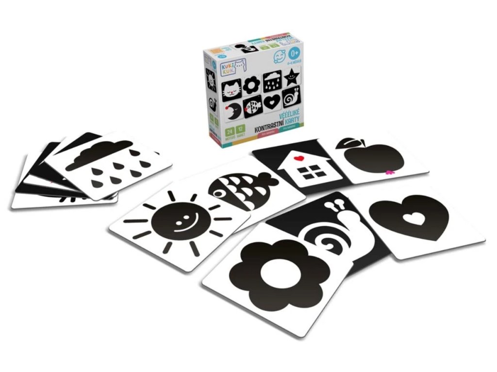 V prvních měsících života mají kojenci omezenou schopnost vidět barvy a detaily. Jejich oči jsou přitahovány jen k vysokému kontrastu, který jim pomáhá rozlišovat objekty ve svém zorném poli. V tomto vývojovém stádiu můžeme rozvíjet jejich zrak a paměť takzvanými kontrastními obrázky. Ty jsou založeny na zobrazení velmi jednoduchých a zřetelných tvarů. Učí děti fixovat zrak a rozeznávat základní obrysy. Tuto dovednost trénují i naše „Kontrastní karty pro miminka“. Rodič dítěti ukazuje tyto velké obrázky a dává mu tím první impulsy k vizuálnímu pochopení světa kolem sebe. Hra se stane stavebním kamenem pro všechny budoucí učební procesy dítěte.