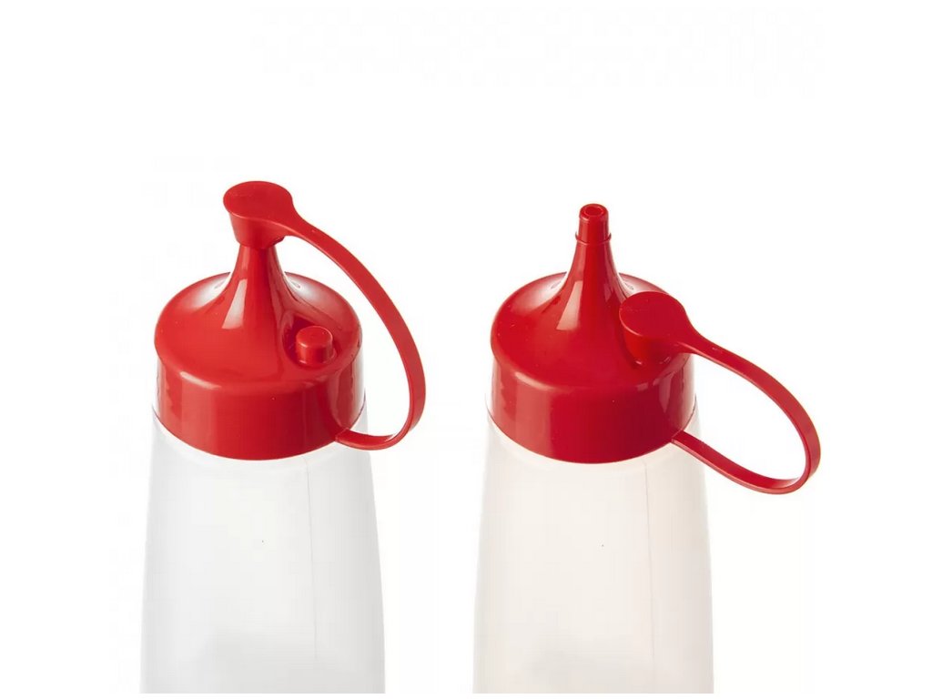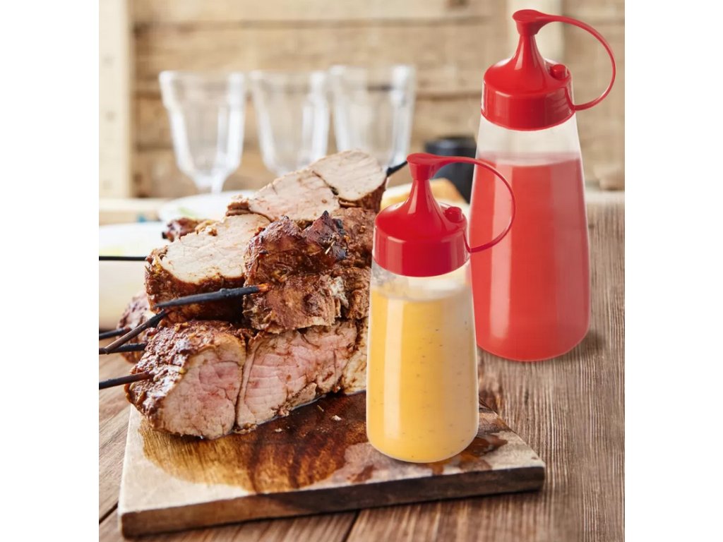 Šikovnou dávkovací láhev využijete v domácnosti i při grilování na studené BBQ omáčky, dochucovadla, kečup, hořčici nebo majonézu nebo pro přípravu dresingu na salát. Je vyrobena z poloprůhledného plastu LDPE plastu a kryta víčkem s uzávěrem v červené barvě, který je z PP plastu. Hodí se i na krémy, čokoládovou polevu, karamelový nebo ovocný toping, kterým můžete polévat zákusky, dorty a zmrzlinové poháry.