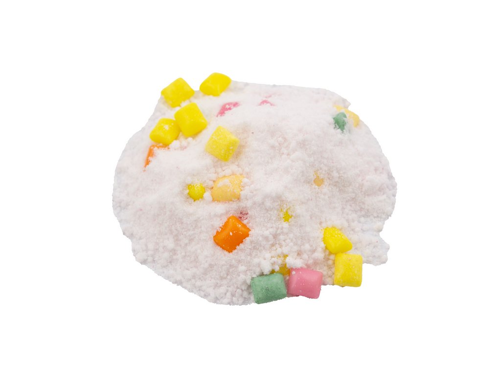 Složení: cukr, dextróza, regulátory kyselosti: kyselina citronová, hydrogenuhličitan sodný; žvýkačková báze, glukóza, zahušťovadlo: arabská guma; zvlhčující látka: sorbitol; protispékavá látka: stearát hořečnatý; emulgátor: slunečnicový lecitin; lešticí látky: karnaubský vosk, mikrokrystalický vosk; látka zvýrazňující chuť a vůni: aspartam*; aromata, barviva: karmín, chlorofylin měďnatý, extrakt z papriky, kurkumin. *Obsahuje zdroj fenylalaninu. Může obsahovat stopy SÓJI.