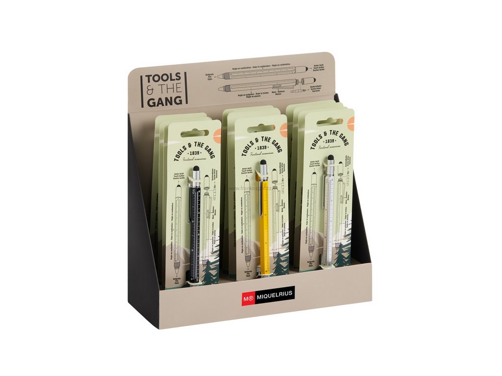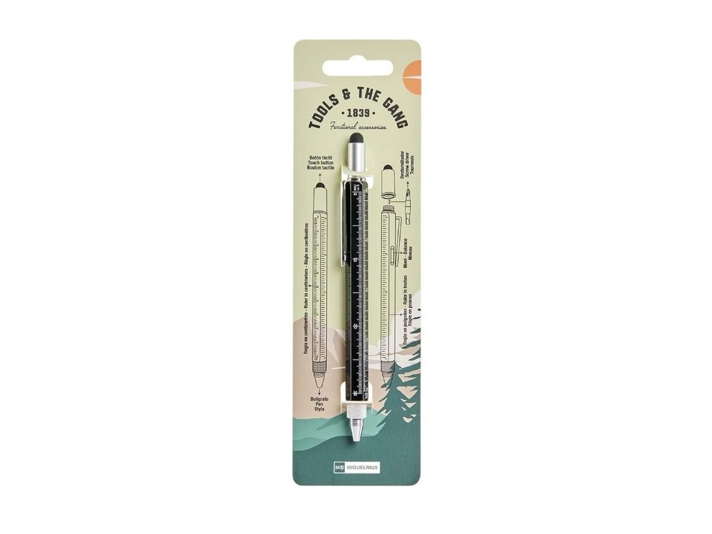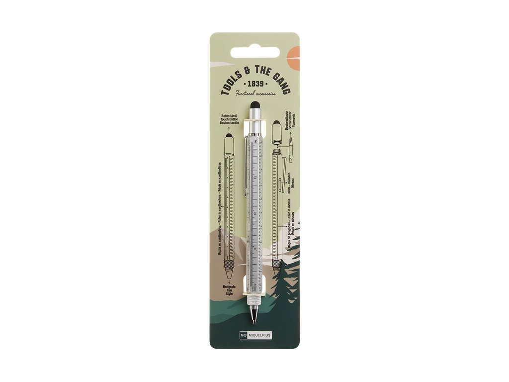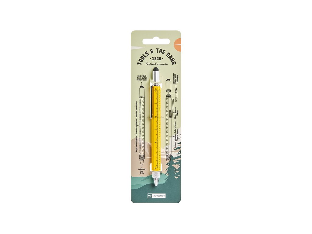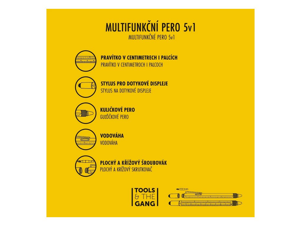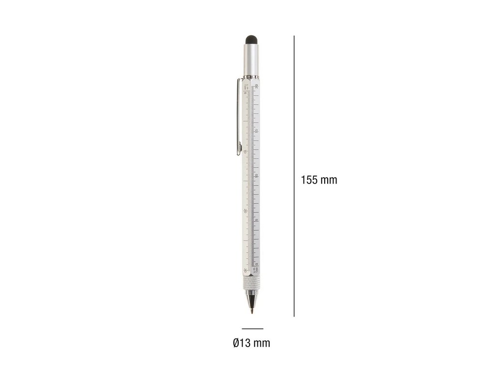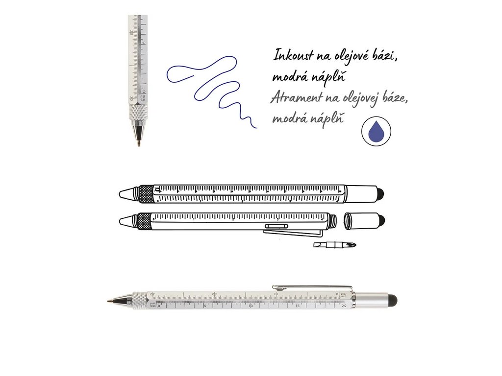 5 v 1: kuličkové pero, pravítko v centimetrech i palcích, vodováha, plochý a křížový šroubovák, dotykový stylus na tablety a chytré telefony