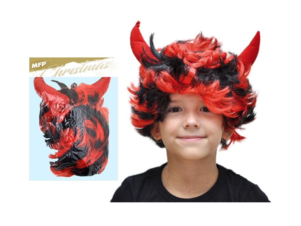 Čertovská paruka s rohy a krátkými černo červenými vlasy. Na vniřní straně paruky je prodyšná sítka, díky tomu se Vám nebude potit v masce hlava. Okraj paruky je opatřený gumičkou, aby maska dobře přilnula a nepadala.Výrobek je zdravotně nezávadný.