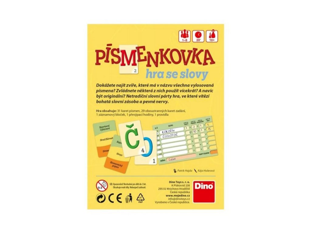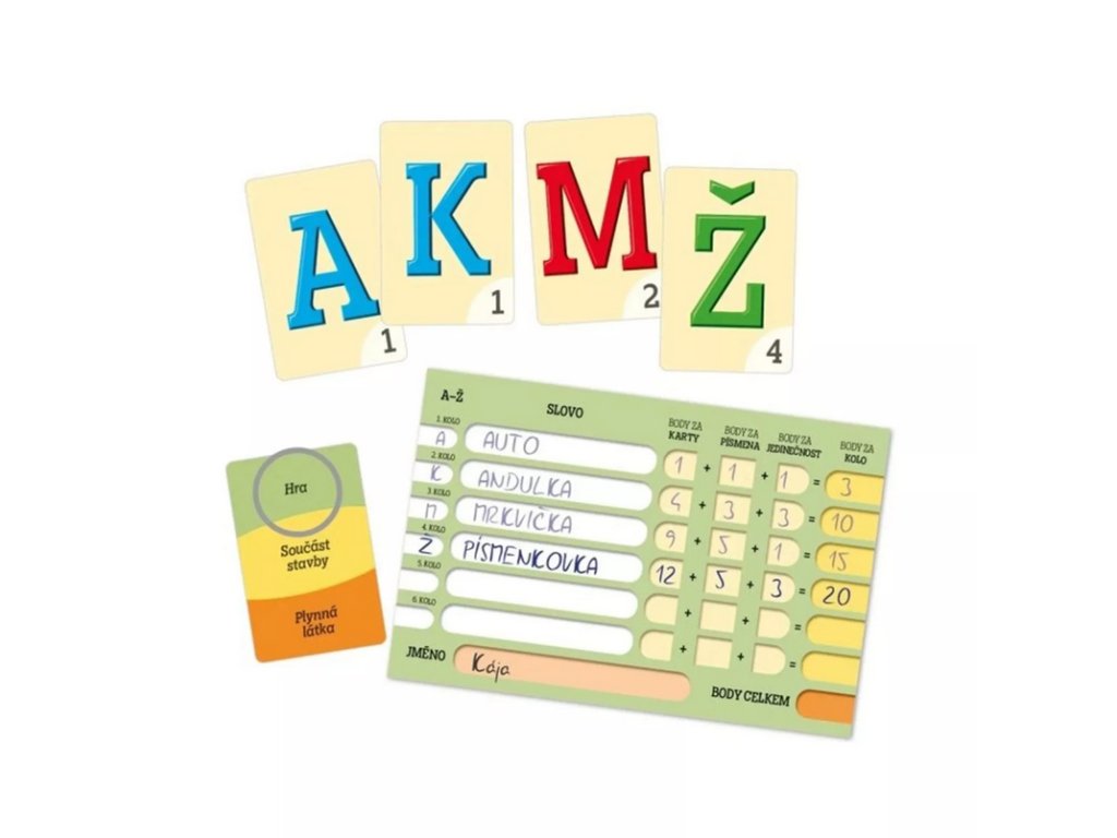Hra Písmenkovka obsahuje: 31 karet písmen, 29 oboustranných karet zadání, 1 záznamový bloček, 1 přesýpací hodiny, 1 pravidla.