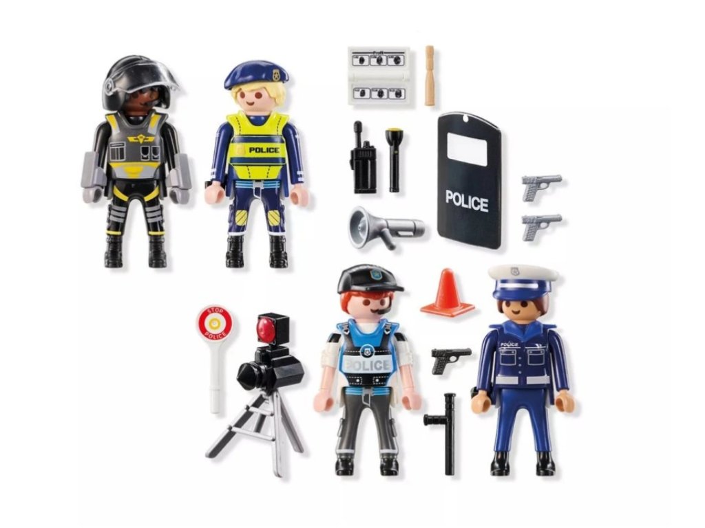 Obsahuje: 3 policisti a 1 policistka, 3 pistole, 1 policejní štít, 2 policejní obušky, 1 ochranná vesta SEK, 1 vysílačka, 1 radar, 1 policejní vesta, 1 sada s otisky prstů, 1 baterka, 1 megafon, 2 dopravní kužely