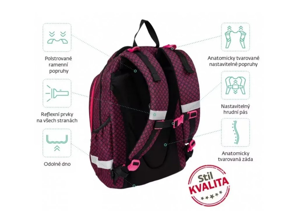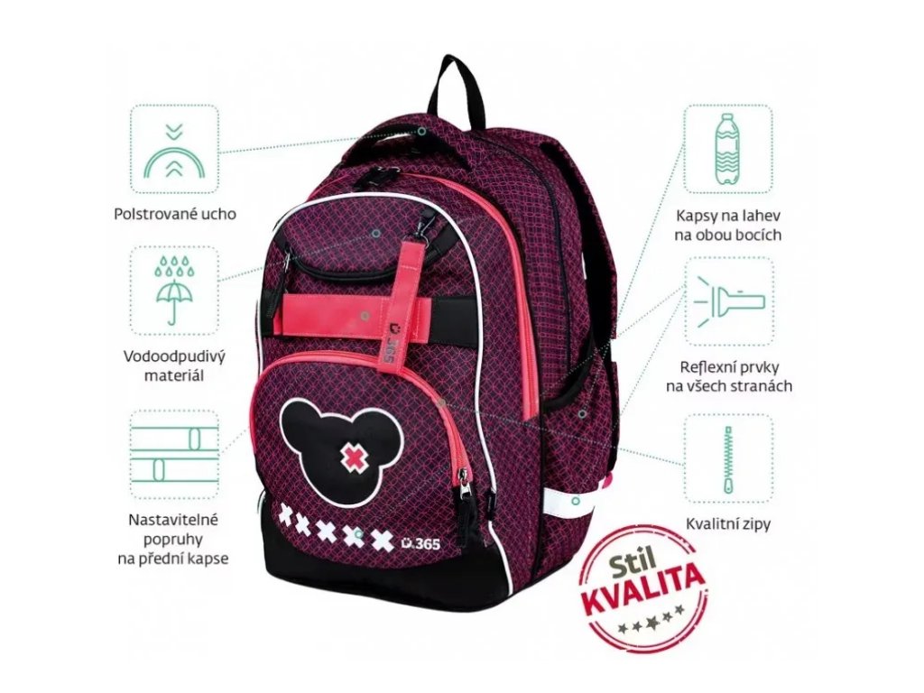 Přední kapsy vhodné na penál, svačinový box a další drobnosti.