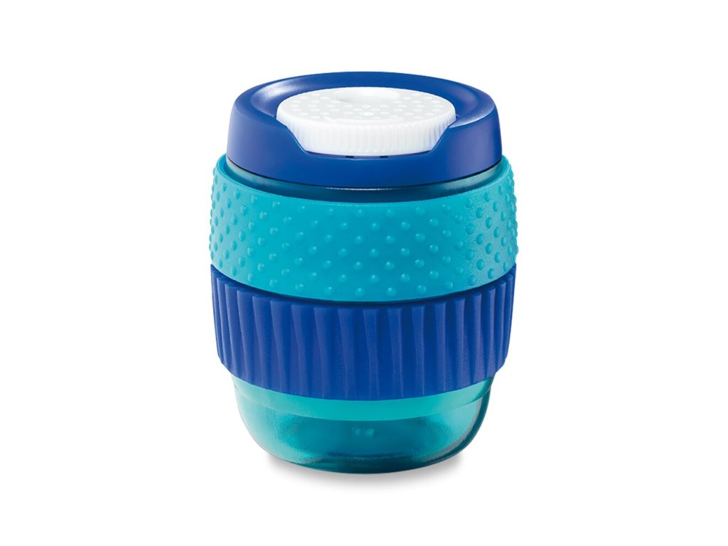 - ořezávátko na jednu tužku s odpadní nádobkou a s otočnými měkkými kroužky, které poskytují smyslovou stimulaci svým rotačním pohybem