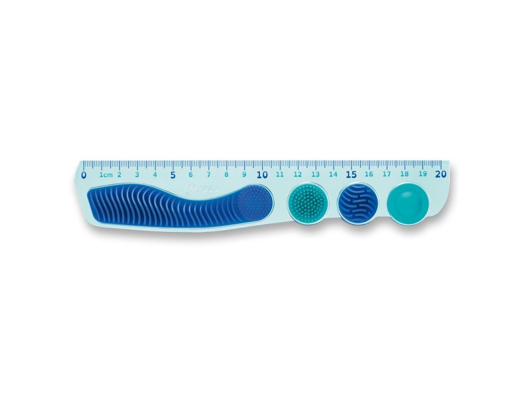 - pravítko 20 cm s protiskluzovou úpravou pro lepší držení a hmatovými oblastmi pro zlepšení koncentrace