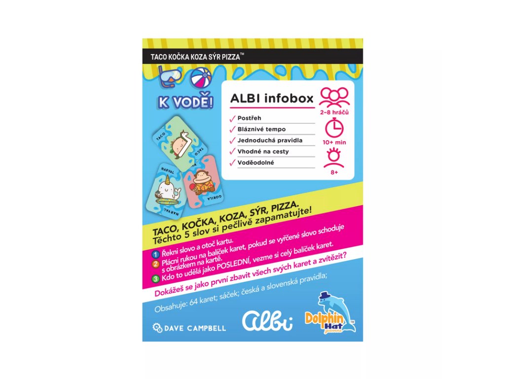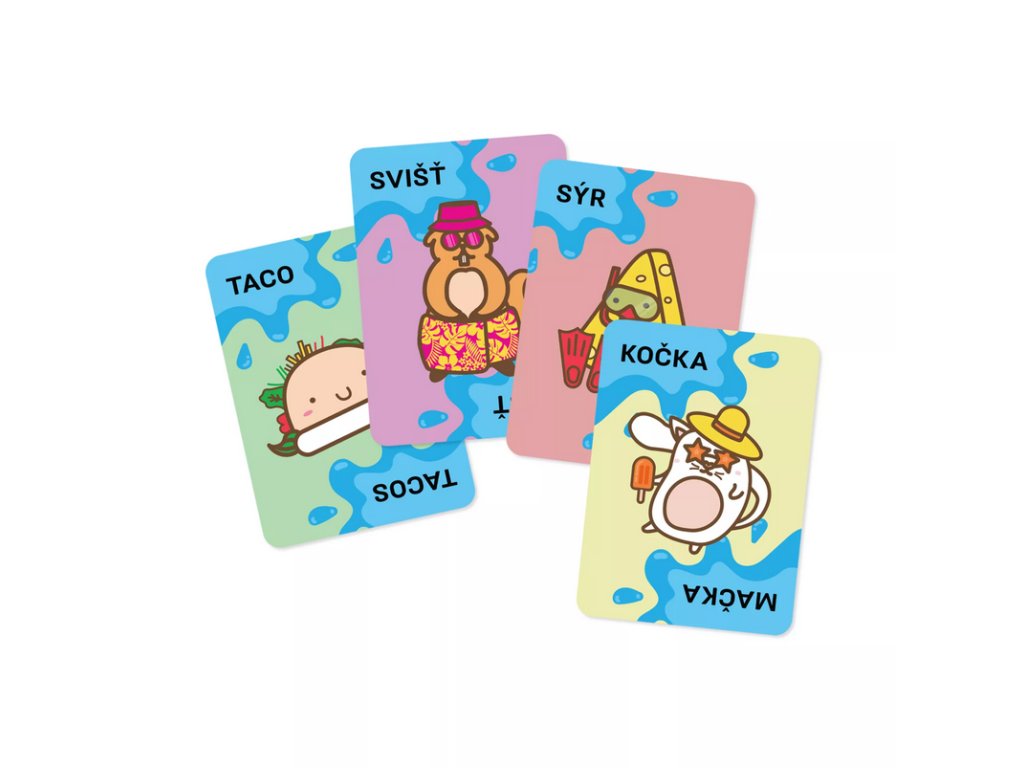 Hra Taco, kočka, koza, sýr, pizza - K vodě obsahuje: 64 voděodolných karet, stahovací sáček, česká a slovenská pravidla.