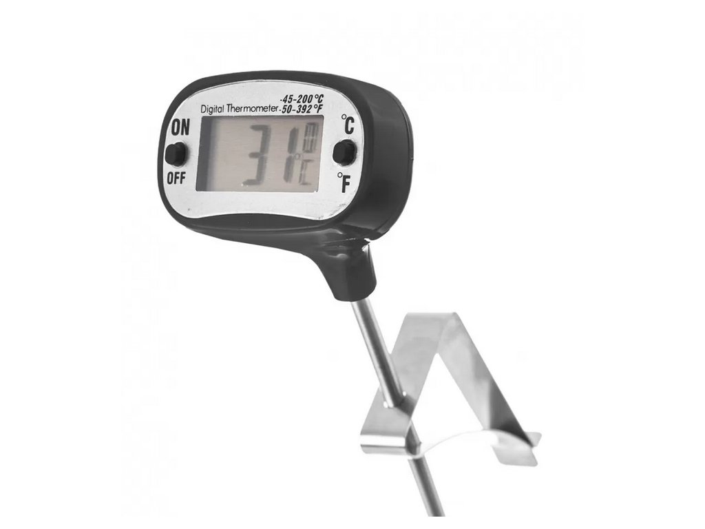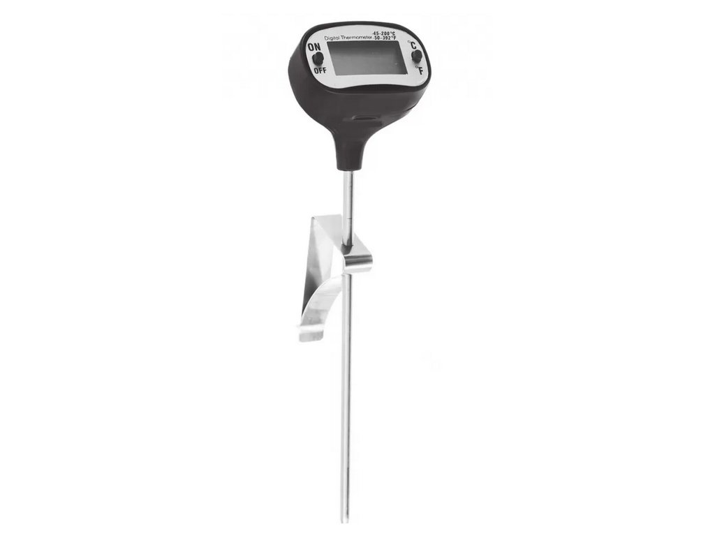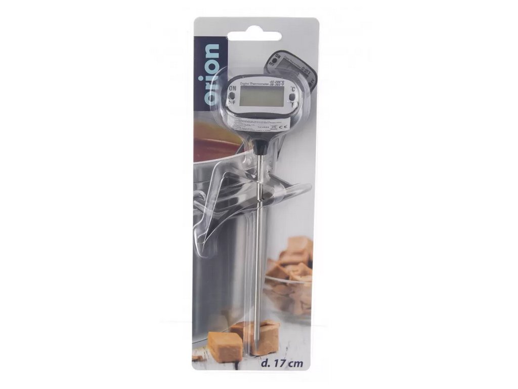 U šťavnatého anglického roastbeefu, pořádného steaku, uzeného masa, ale i cukerného rozvaru nebo karamelu je důležité hlídat vnitřní teplotu. K tomu výborně slouží univerzální teploměr, který měří teplotu potravin (masa mimo troubu nebo gril, nápojů, olejů na smažení, při výrobě cukrovinek) i vzduchu. Stačí zapíchnout nebo vložit nerezový hrot do připravovaného pokrmu, případně zavěsit teploměr za postranní klip na hranu hrnce.