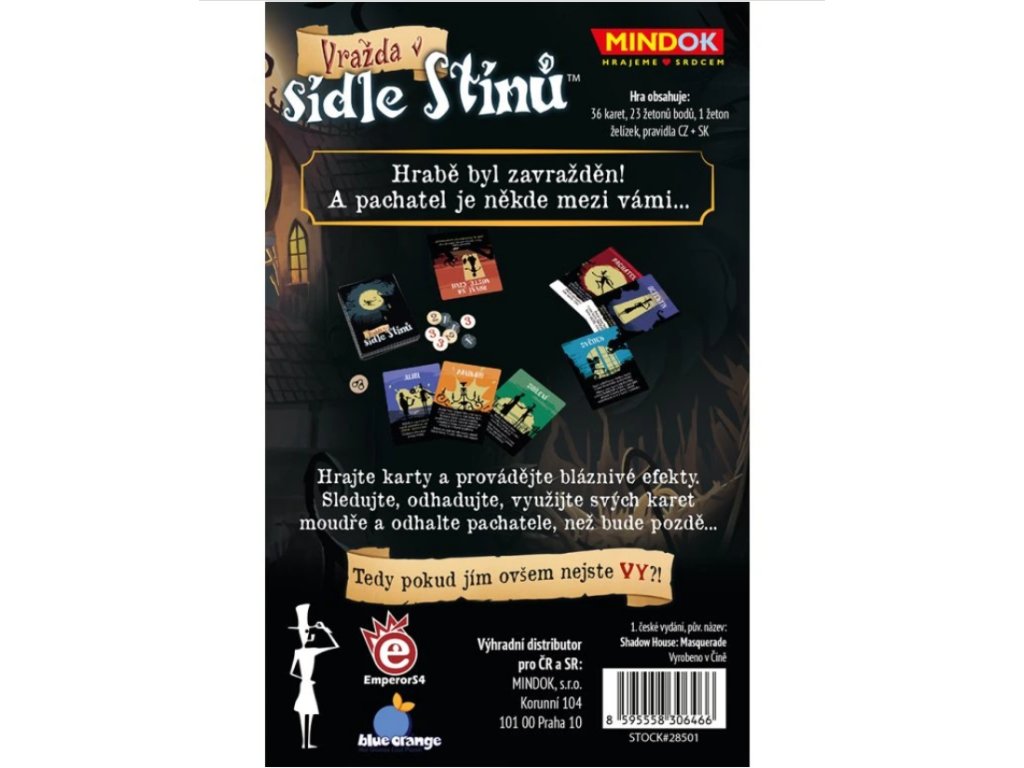 Vražda v sídle stínů je blafovací a dedukční karetní hra plná rolí, ve kterých každý hráč obdrží na začátku kola 4 karty a pokouší se splnit svůj cíl dříve než ostatní. Hráči se střídají v tazích, vykládají karty lícem vzhůru před sebe a okamžitě provádí jejich efekty. Karty mají celou řadu akcí, od nahlížení do soupeřovy ruky (SVĚDEK), přes nucené výměny karet (SDÍLENÍ, KLEVETY, VÝMĚNA), až po pokládání žetonu želízek na podezřelého (ŠERIF).