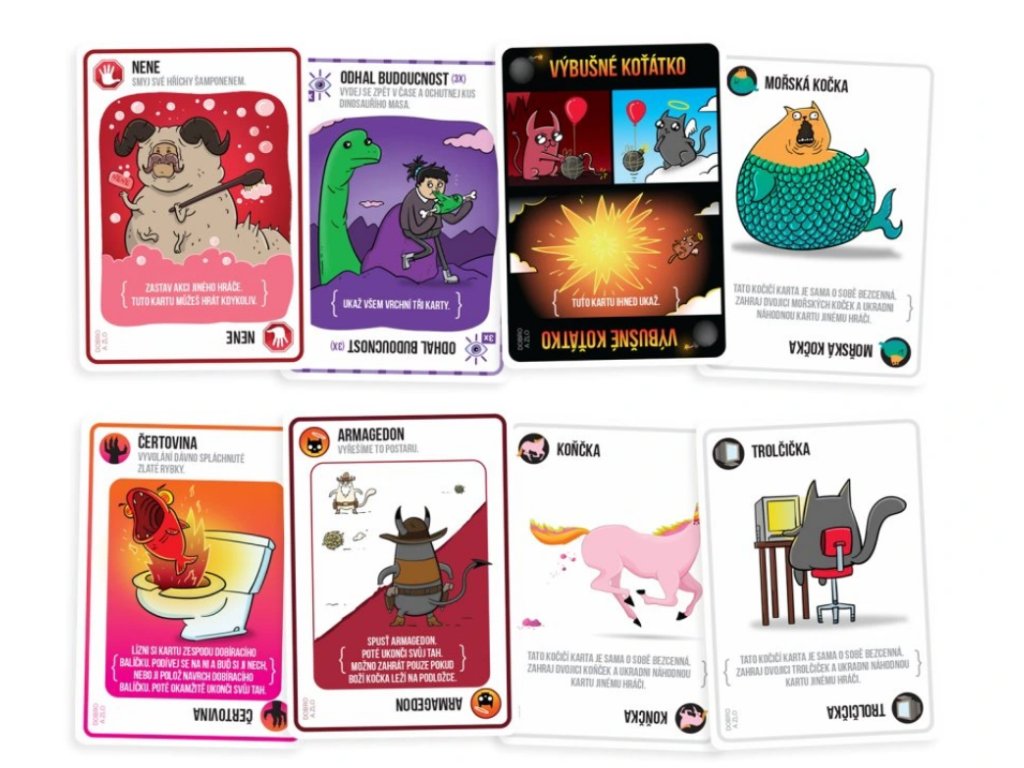 Vtipné ilustrace s ještě vtipnějšími texty vás pobaví a plně vtáhnou do hry, kterou budete chtít hrát stále dokola. Každá karta je originál. Pravidla hry jsou velice jednoduchá, vysvětlená za pár vteřin.