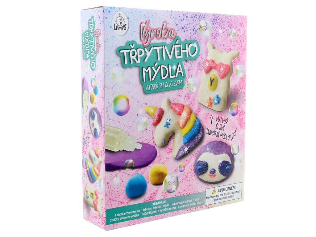 Balení obsahuje vše potřebné: rýžovou mouku, tekuté mýdlo, odměřovací kelímek, lžíci, slidový prášek, esenci, třpytky, papirovou desku a návod.