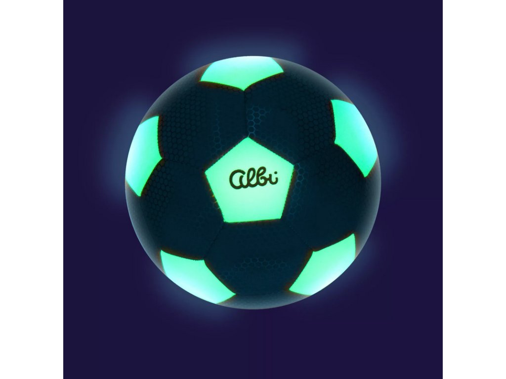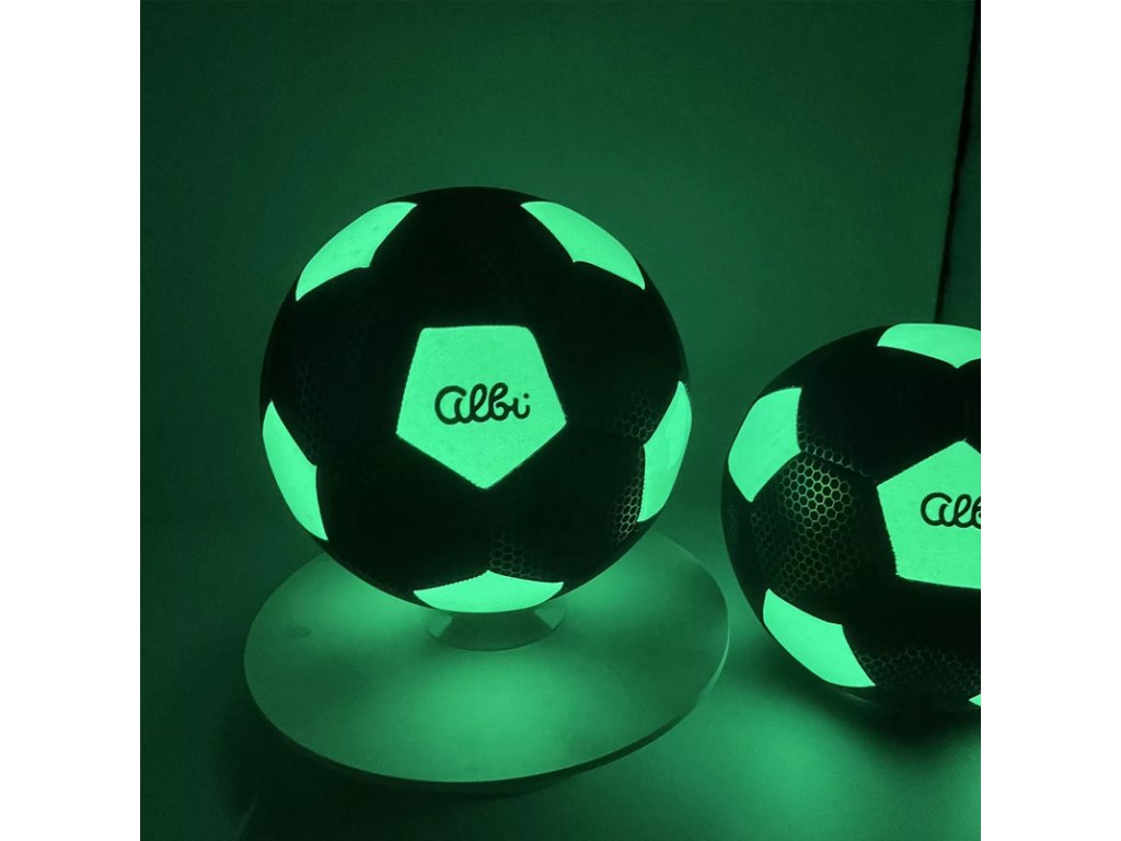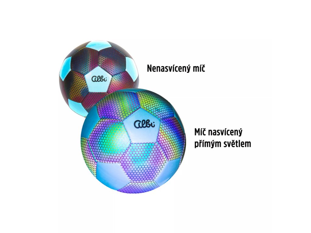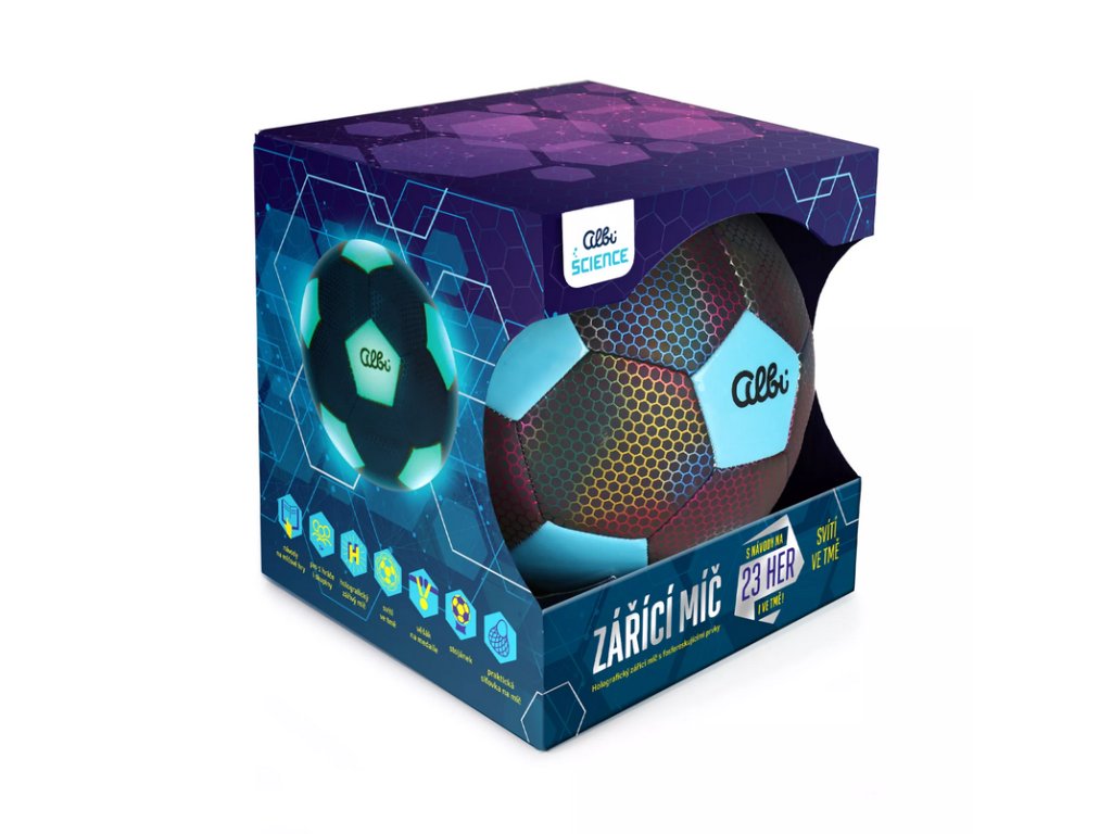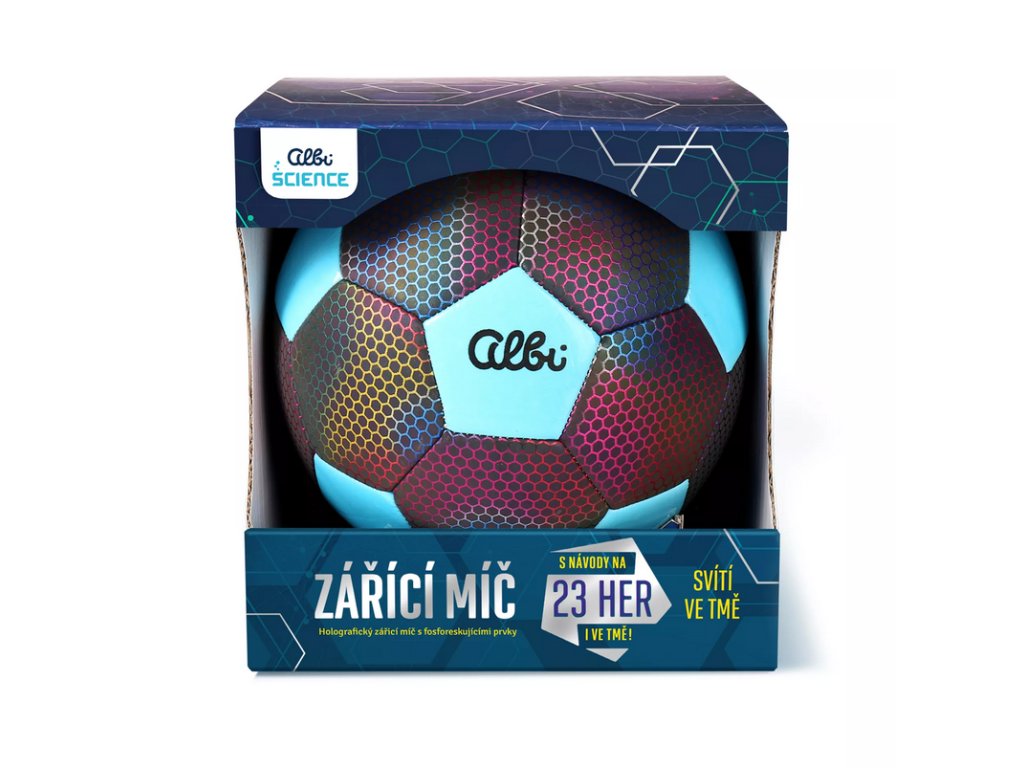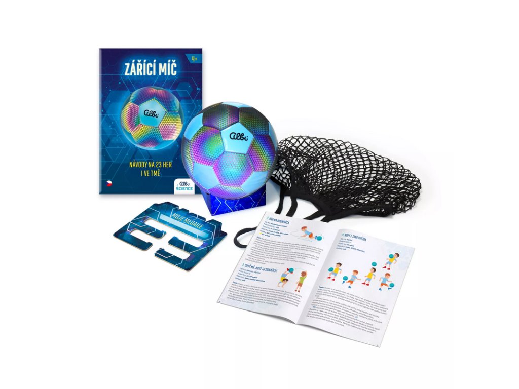 Sada Zářící míč obsahuje: holografický zářící míč s fosforeskujícími prvky, stojánek na míč, věšák na medaile, bavlněnou síťovku na míč a návod.